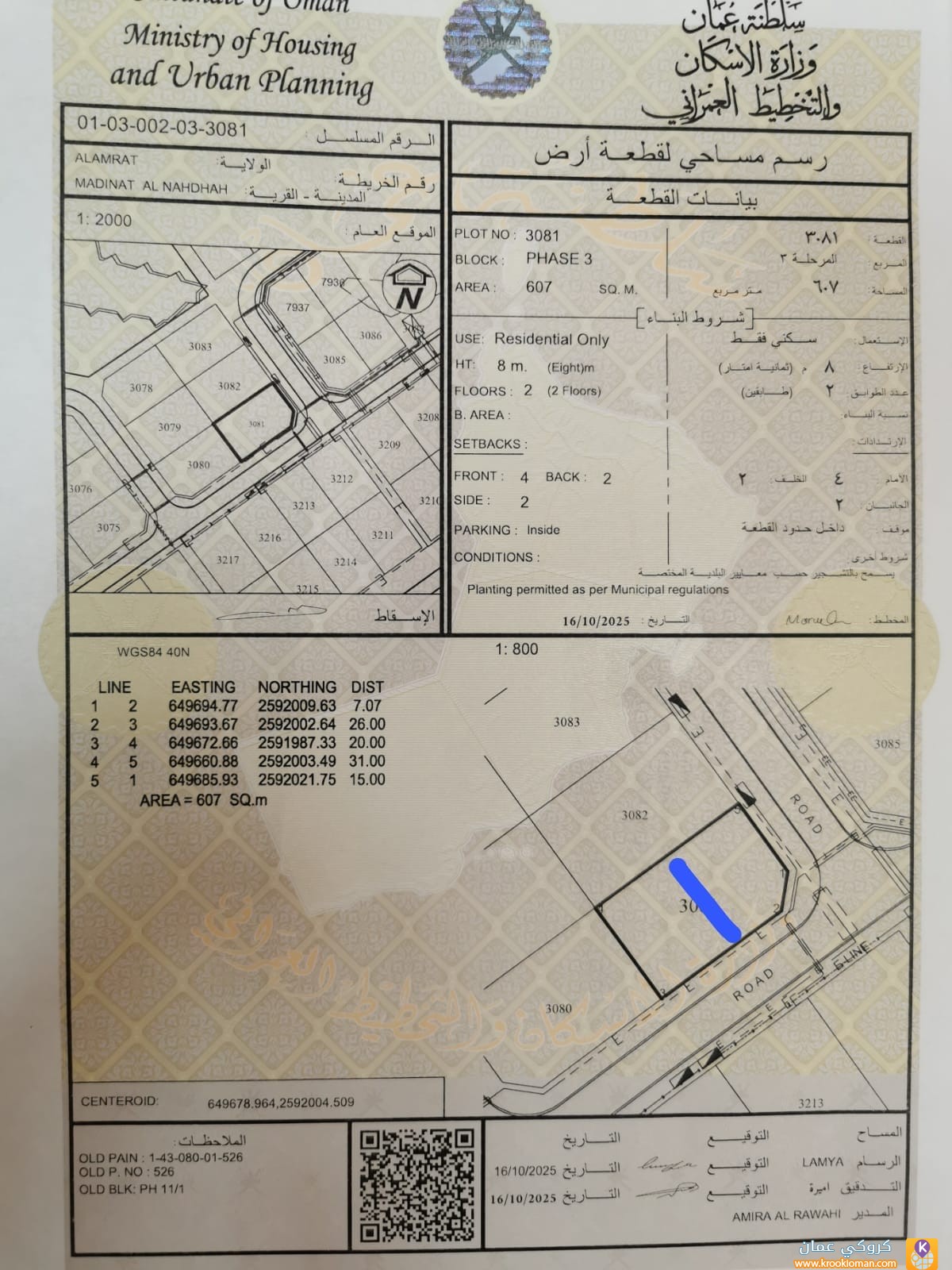 للبيع ارضين شبك في العامرات مدينه النهضه مربع 11/1 مسحتحه كل ارض303