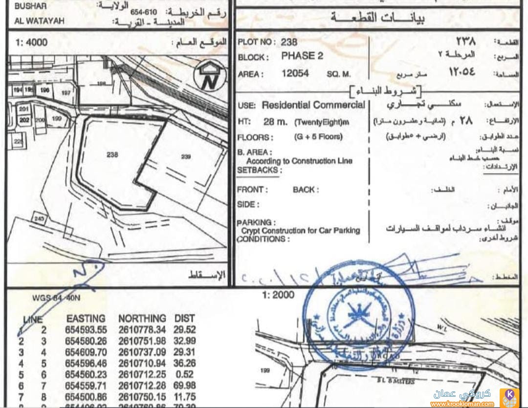 للبيع ارض سكني تجاري في بوشر الوطيه
