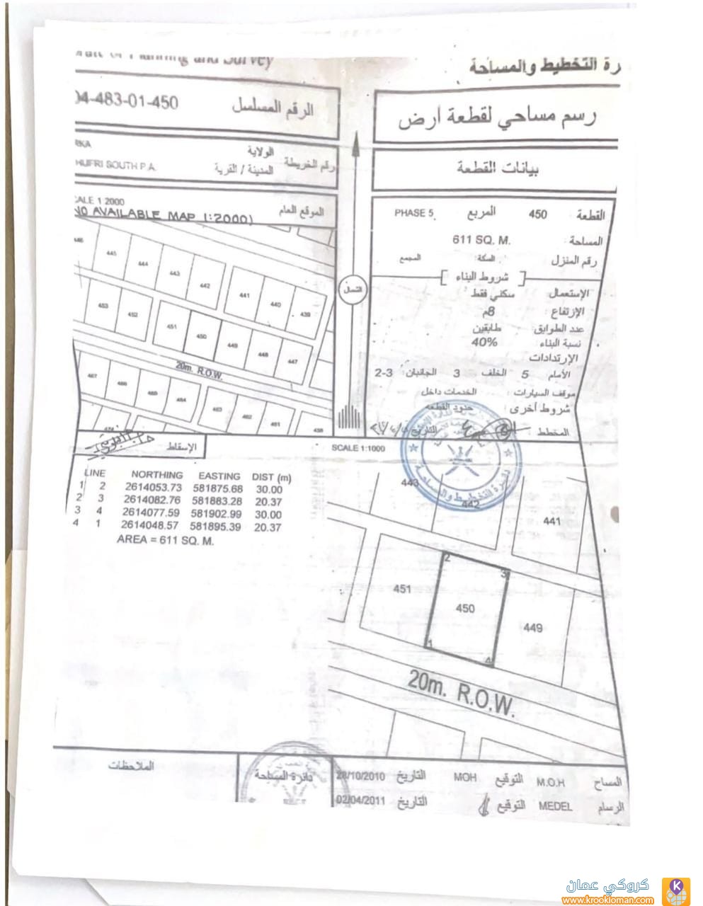 - مساحه الأرض (611)متر مربع ، وسطية ونظيفة ومستوية تماما ، جنبها العديد من المنازل القائمه .