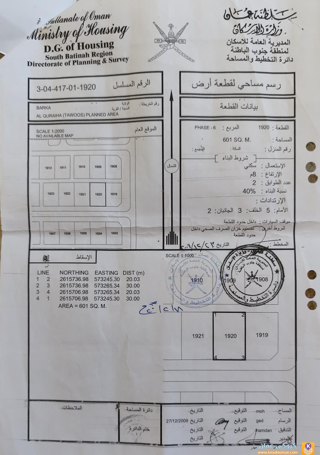 للبيع أرض سكنية ممتازه في بركاء القريحه مخطط الطاؤوس,،